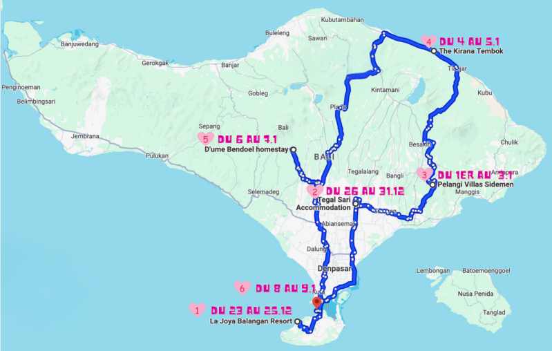 Ci-dessous les 6 étapes de notre aventure Balinaise : 1/ Balangan 2/ Ubud 3/ Sidemen 4/ Tejakulah 5/ Penebel 6/ Jimbaran